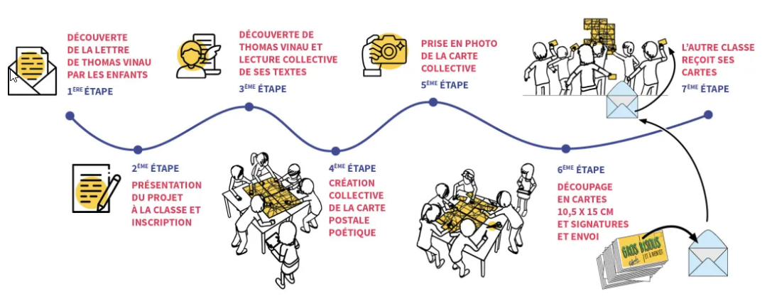 À partir de la lettre de Thomas Vinau (parrain 2026 d’École en poésie), chaque classe produit collectivement et coopérativement une carte postale poétique géante, la découpe et l’envoie à une autre classe qui reconstituera ce puzzle composé d'autant de cartes postales poétiques que d’élèves.